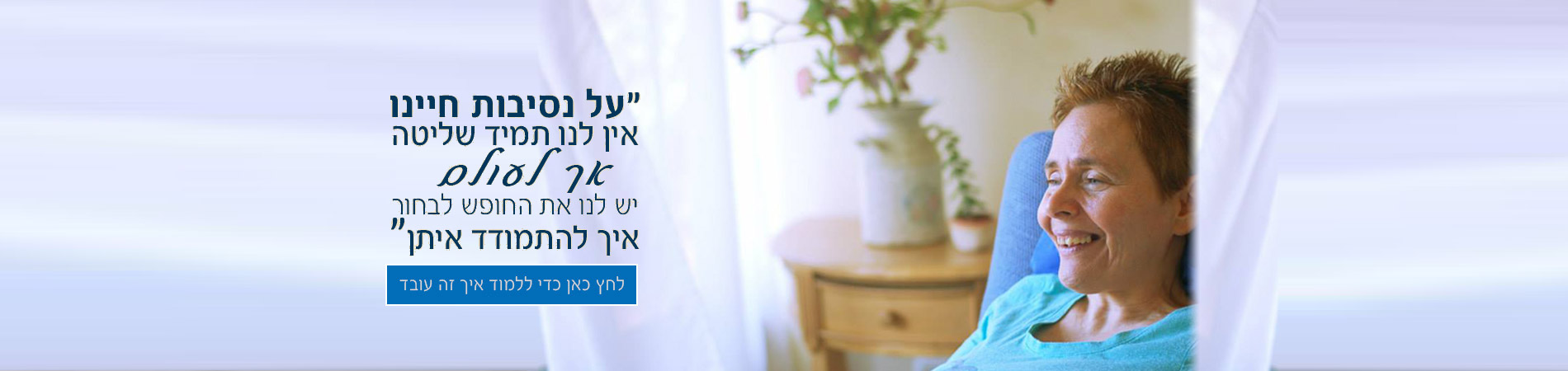 הנחת יסוד שלי היא שבנסיבות חיינו אין לנו תמיד שליטה אך תמיד אנו חופשיים לבחור איך להתמודד איתן.